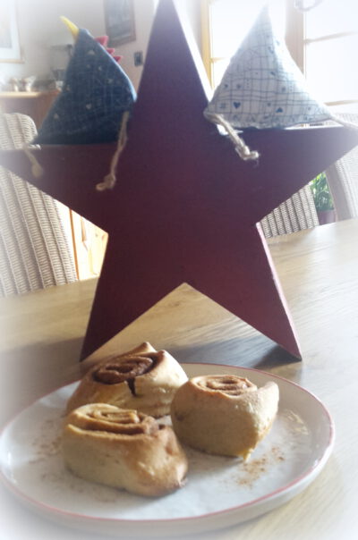 Ich habe mal wieder Zimtschnecken gebacken, mit Sicherheit kein typisches Gebäck in der vorweihnachtlichen Zeit, aber frisch aus dem Backofen so lecker. Für die Füllung habe ich zum Zimt noch ein wenig Kardamon, Anis, Vanille und Orangenabrieb gegeben und schon duftet das Haus weihnachtlich.
