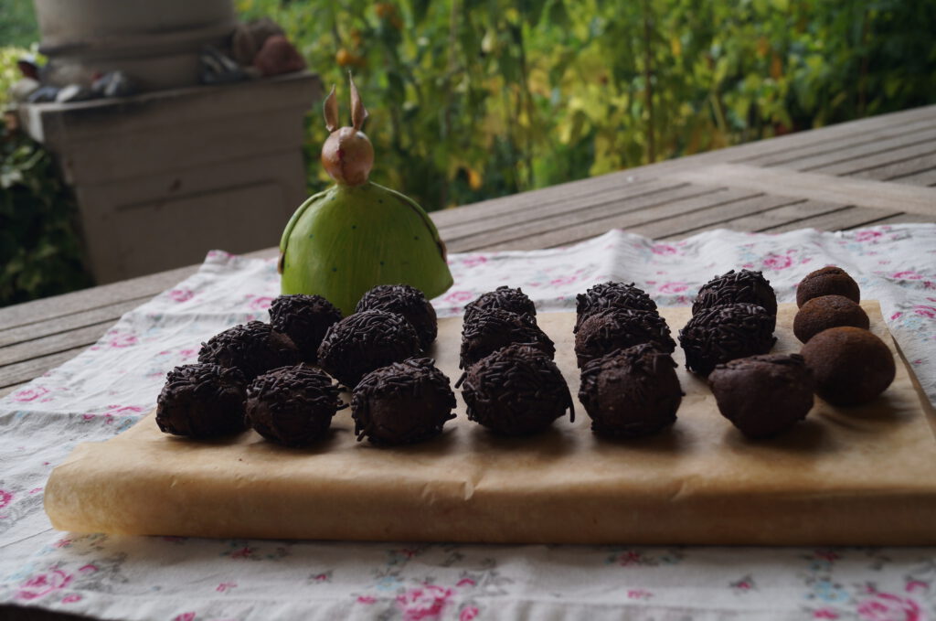 Meine Rumkugeln sind ja auch keine wirklichen Rumkugeln, denn ich gebe statt Rum einen Kaffeelikör (natürlich in Bio-Qualität) dazu. Weitere Zutaten sind in Sahne geschmolzene Bitterkuvertüre, gemahlene Haselnüsse, Kakao und ein wenig Butter.