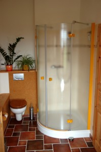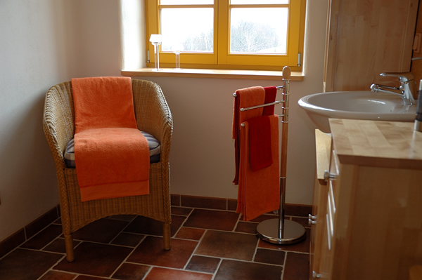 Wie im ganzen Haus gilt auch hier: Atmende Baustoffe und Farben, Lehmputz, Wandheizung, Korkböden, Vollholzmöbel, Netzfreischalter, abgeschirmte Kabel, Naturbettwaren kbA in Übergröße, Naturkopfkissen kbA mit Dinkel- oder Hirsespelz, geölte Oberflächen, ausschließliche Verwendung von ökologischen Wasch- und Reinigungsmittel.