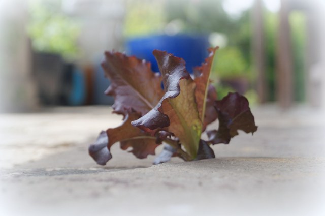 Manchmal schaffen wir es nicht die ausgeblühten Pflanzen rechtzeitig zu beernten. Dann säet sich – auf unserem Grundstück ganz oft zu sehen – zum Beispiel der Mangold an Ort und Stelle wieder aus. Aber auch so etwas passiert, wir haben ihn liebevoll Ritzensalat genannt. Beim Pulen der Samen ist wohl ein Körnchen in eine Ritze unserer Terrasse gefallen und ist dort gekeimt.